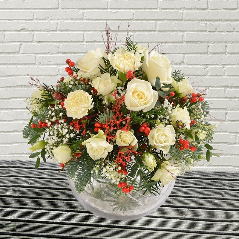 A winter arrangement set in a vase globe, a gift with a gift.