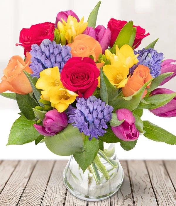 The epitome of spring. Hot pinks mingled with yellow freesia, fragrant blue hyacinth, tulips and orange roses to make a stunning arrangement, sure to impress. Packed up whilst still the flowers are still in bud so the flowers remain fresh for longer