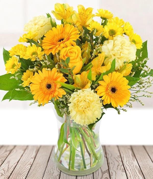This bright and bold bouquet is full of the most beautiful yellow stems, including a single yellow rose, long-lasting alstroemeria, germini, carnations and seasonal foliage.